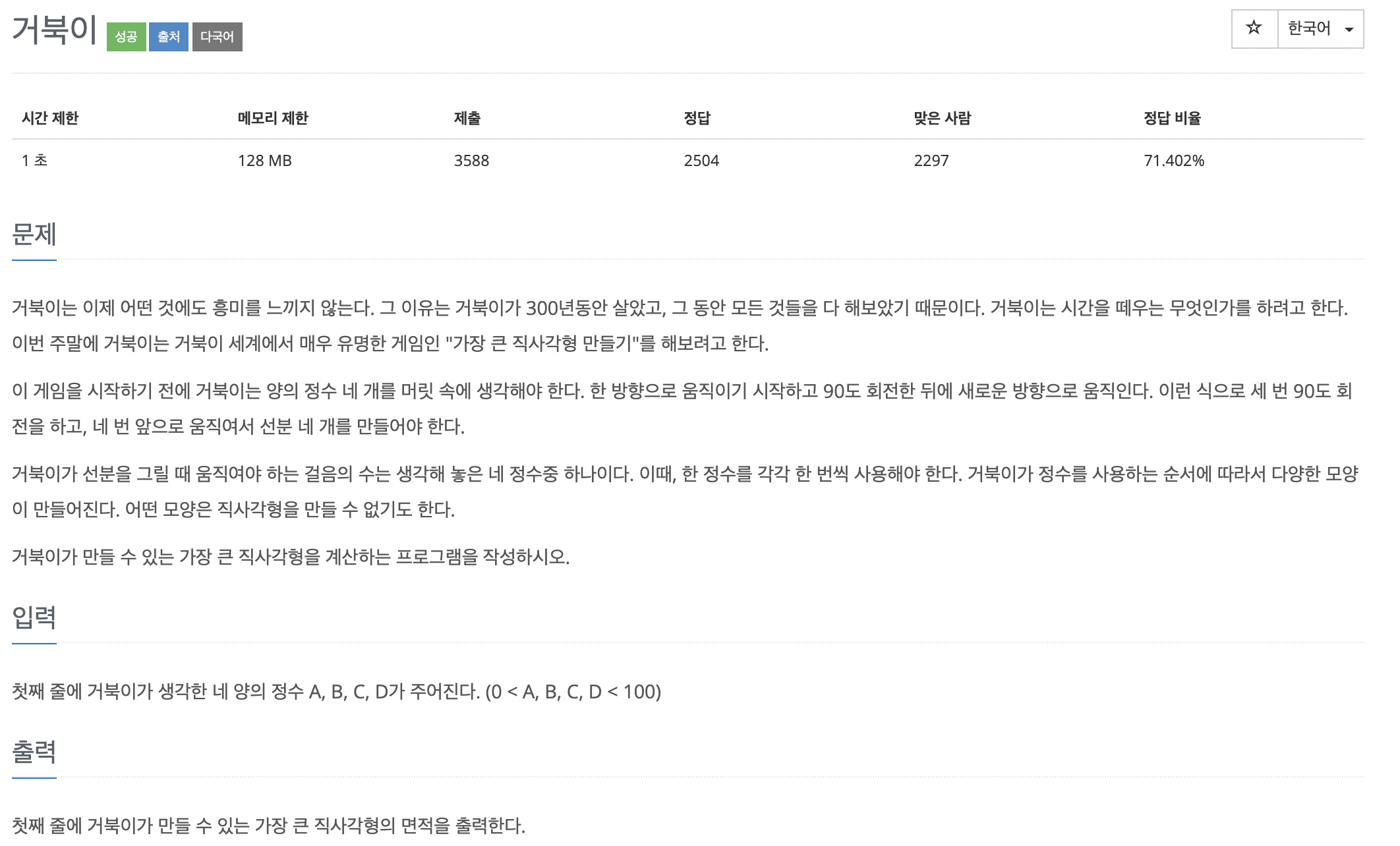 제일 큰 직사각형을 만드는 공식은 (두번째로 큰 수*제일 작은 수) 이다.