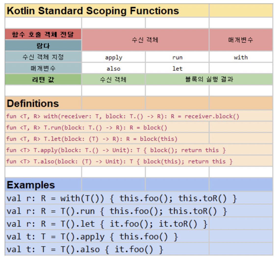 -apply() : 수신 객체를 이어지는 함수 블록의 리시버로 전달한다. 수신 객체 람다 내부에서 수신객체의 함수를 사용하지 않고 수신 객체 자신을 다시 반환하려는 경우에 사용. ex) 객체의 초기화