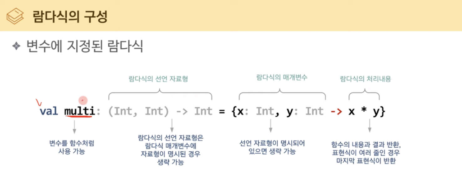 - 변수에 람다식을 넣는 경우 인자의 타입 생략 불가.