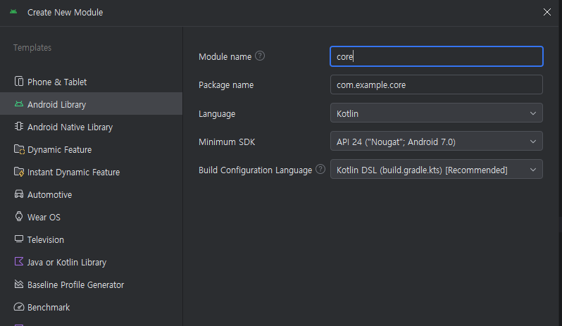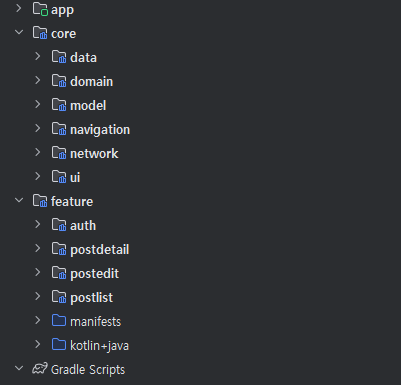나는 간단한 게시판 앱이라서 core, feature 모듈을 만들어 주었다.